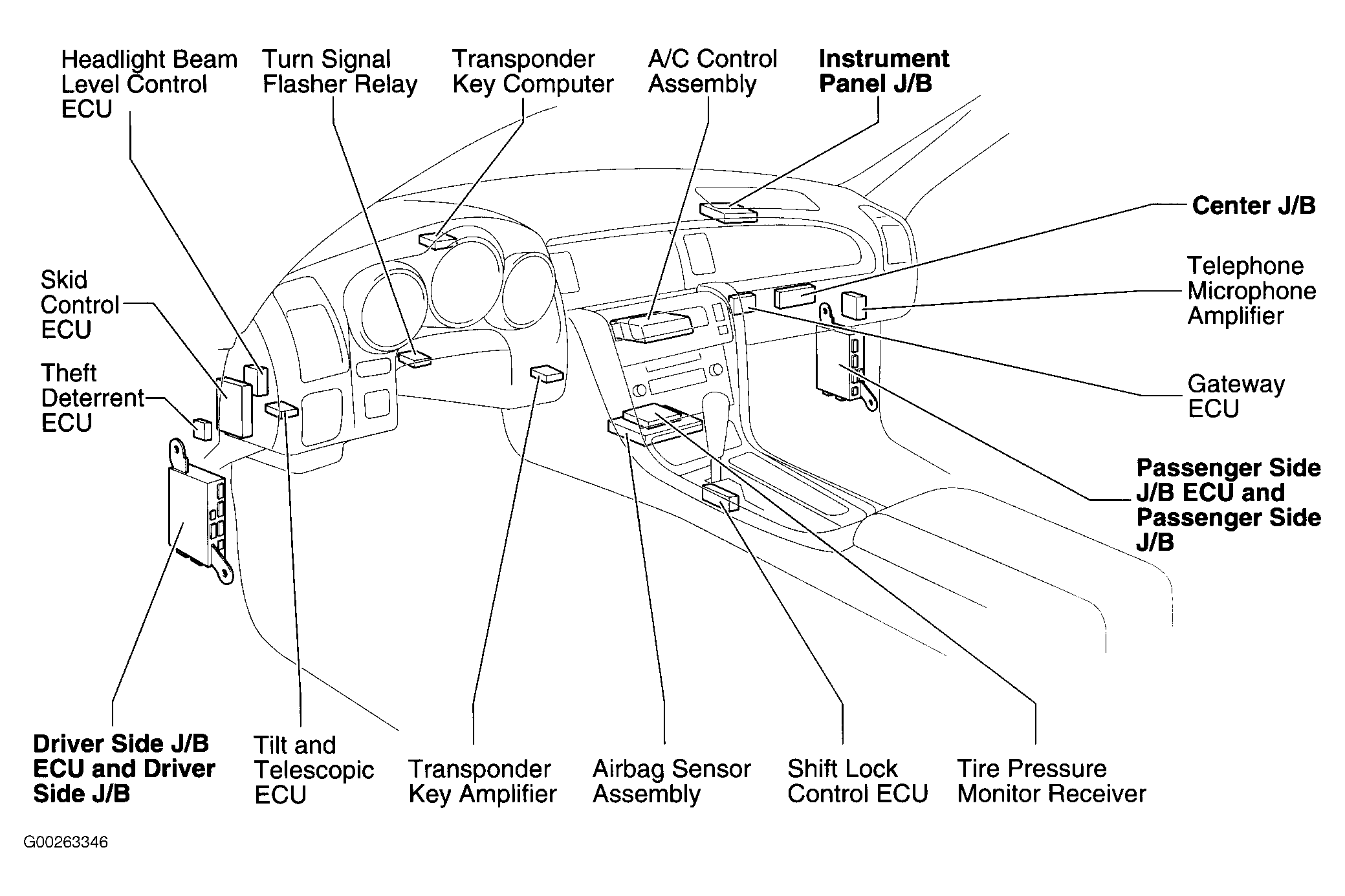 | Theft Deterrent ECU | Behind left end of dash. See Figure. |