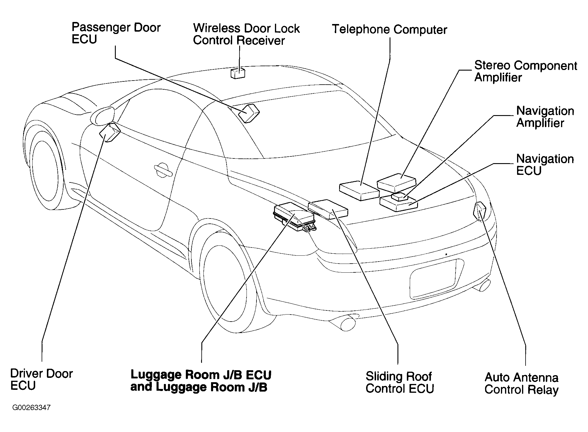 | Navigation ECU | At right rear corner of luggage compartment. See Figure. |