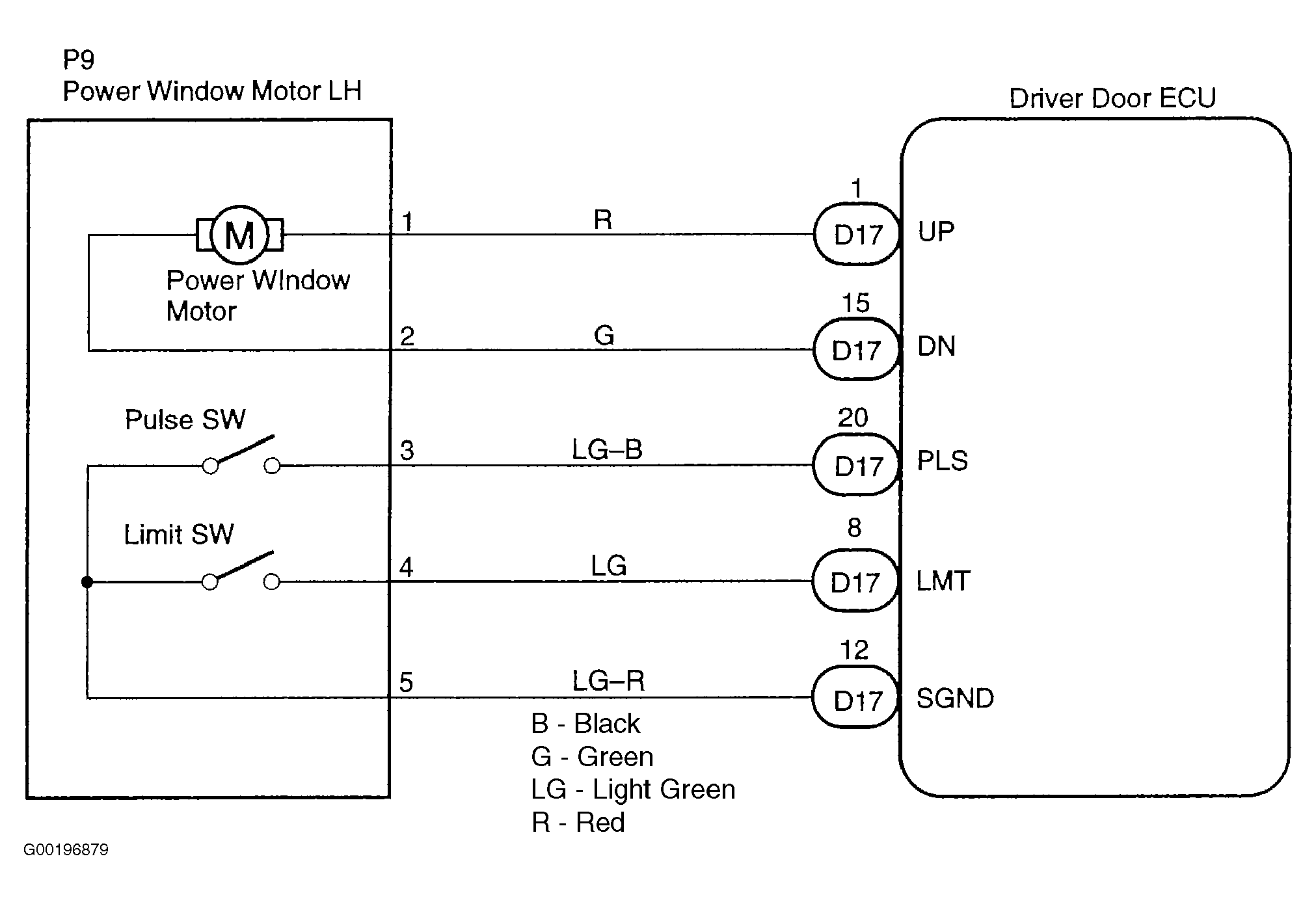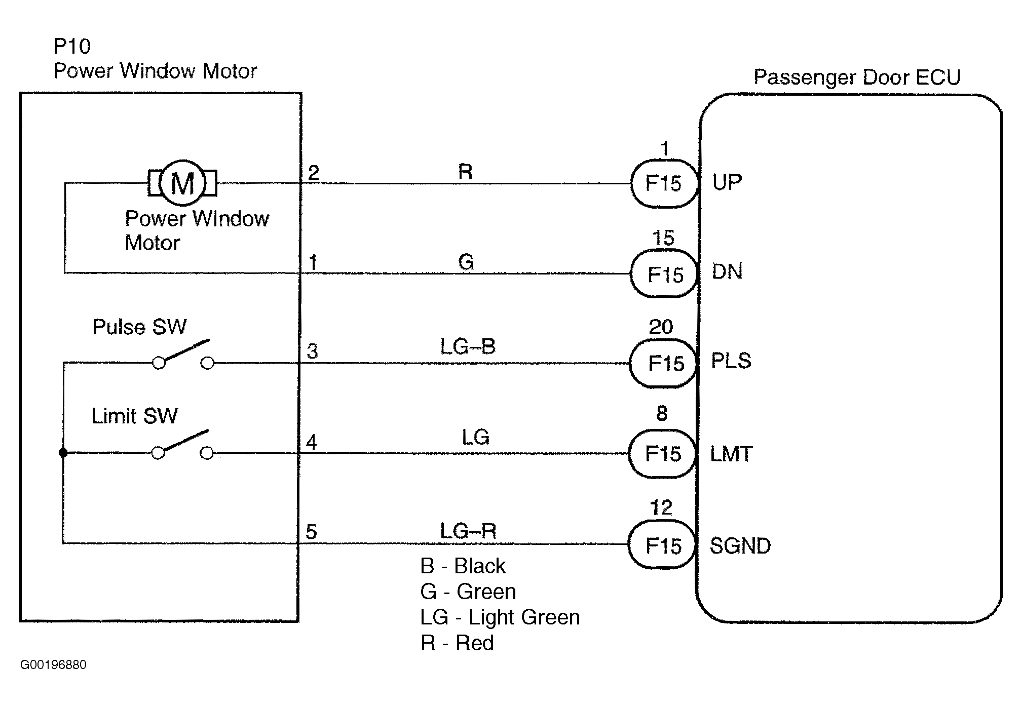 The jam protection limit switch is built-in the power window motor. This switch functions to turn OFF before the top dead center, and ECU reads this OFF signal resulting in closing the window fully. For driver door power window circuit diagram, see Fig 1. For passenger door power window circuit diagram, see Fig 2.