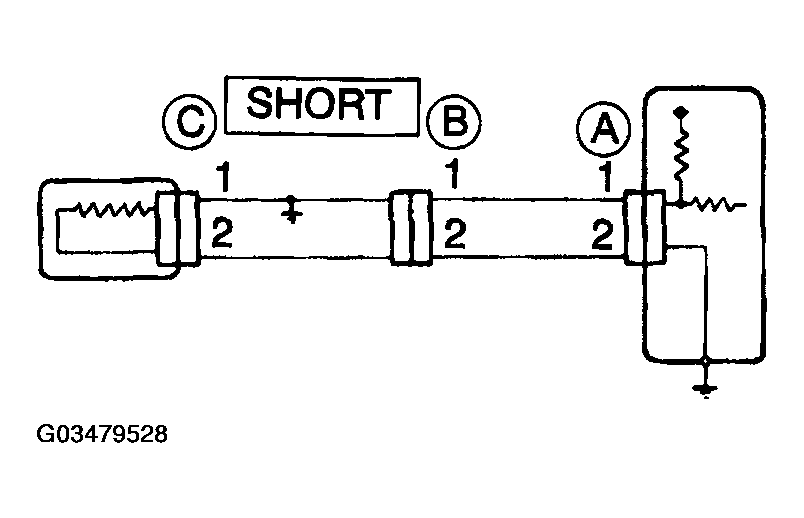 If your results match the examples above, a short circuit exists between terminal 1 of connector A and terminal 1 of connector C.