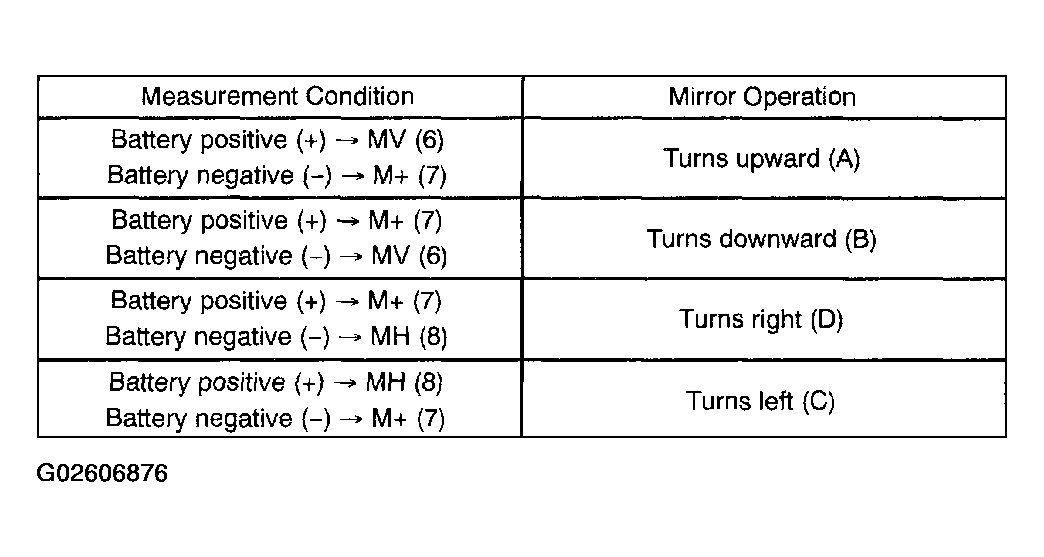 OUTER MIRROR SWITCH (LEFT SIDE)Terminal No. Switch Position Specified Condition - OFF 10 kΩ or higher 4-8 UP Below 1 Ω 6-7 4-7 DOWN Below 1 Ω 6-8 5-8 LEFT Below 1 Ω 6-7 5-7 RIGHT Below 1 Ω 6-8 If the result is not as specified, replace the switch assy.