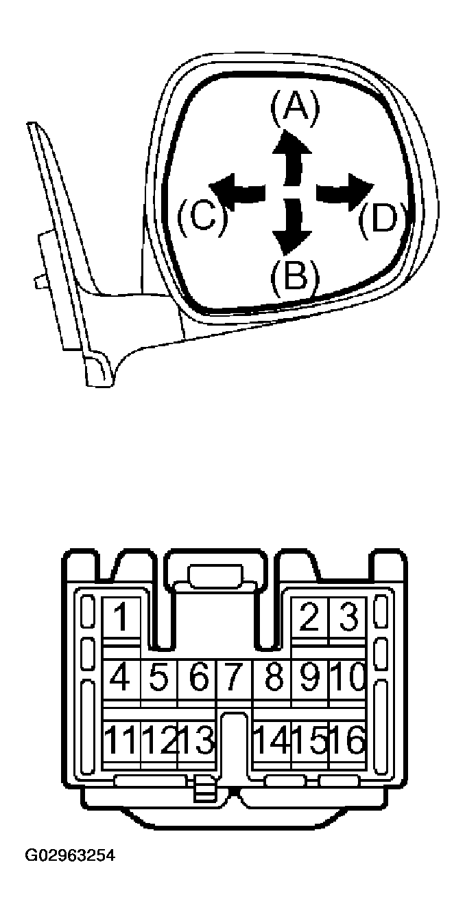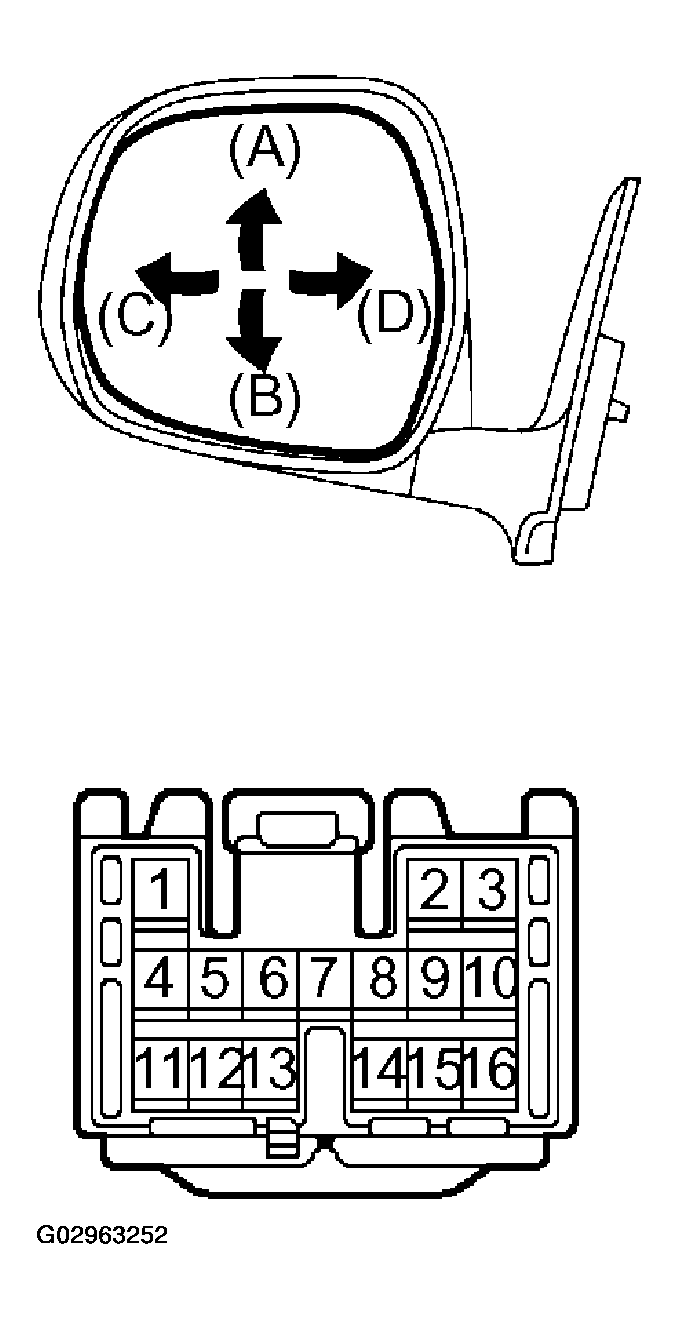 3. Check that the resistance between terminals 9 and 16 changes when slowly turning the mirror face right and left.