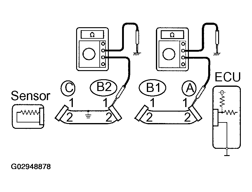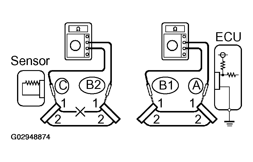2. Disconnect connector B and measure the resistance between terminal 1 of connector A and body ground, and terminal 1 of connector B2 and body ground.