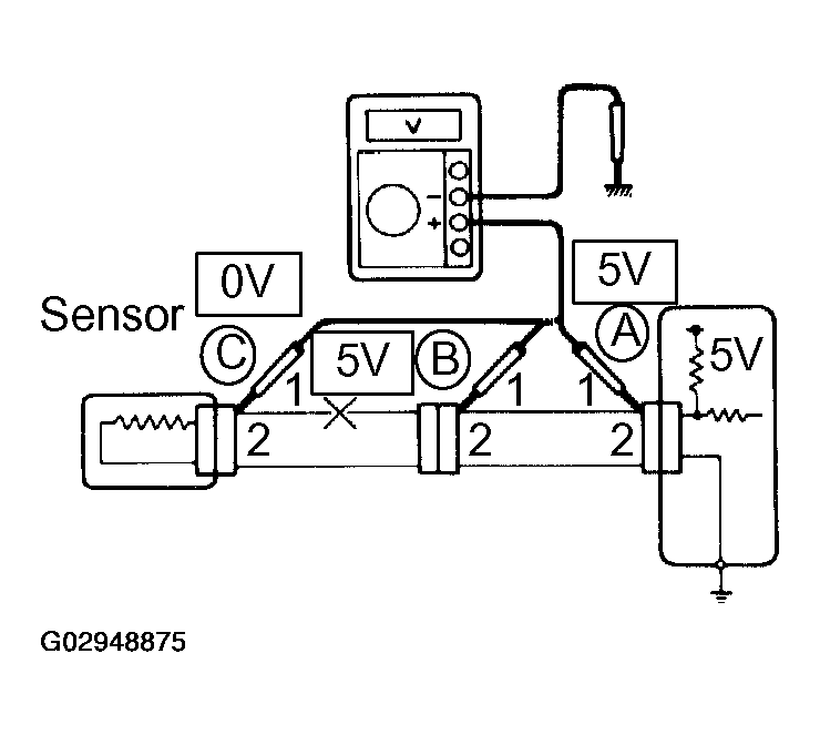 As shown in Fig 12, with each connector still connected, measure the voltage between body ground and terminal 1 of connector A at the ECU 5V output terminal, terminal 1 of connector B, and terminal 1 of connector C (in that order).