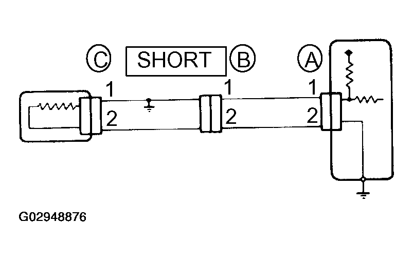 A short circuit is between terminal 1 of connector B2 and terminal 1 of connector C.