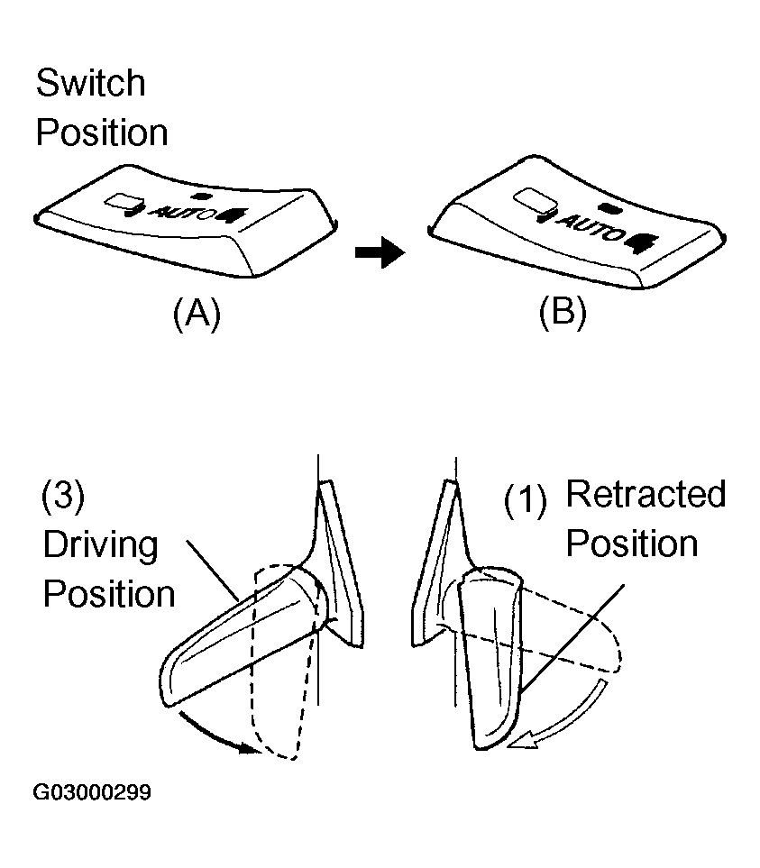 - Perform the above step again. This time, before the mirror operation finishes, turn the ignition switch to ACC and press the retract switch. Check that the mirror operates in the opposite direction.