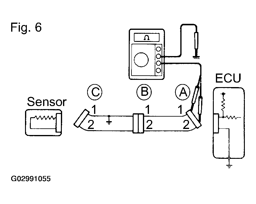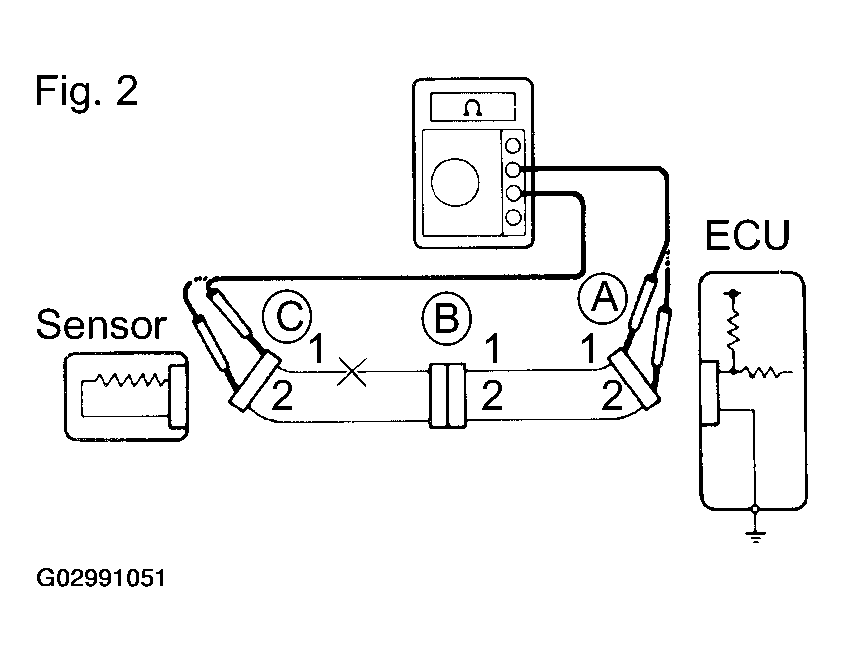 - As shown in Fig 12, with each connector still connected, measure the voltage between body ground and terminal 1 of connector "A" at the ECU 5V output terminal, terminal 1 of connector "B", and terminal 1 of connector "C", in that order.