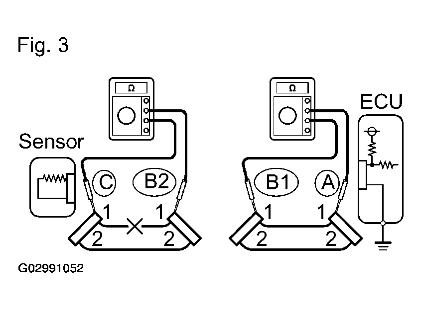 Therefore, it is found out that there is an open circuit between terminal 1 of connector "B2" and terminal 1 of connector "C".