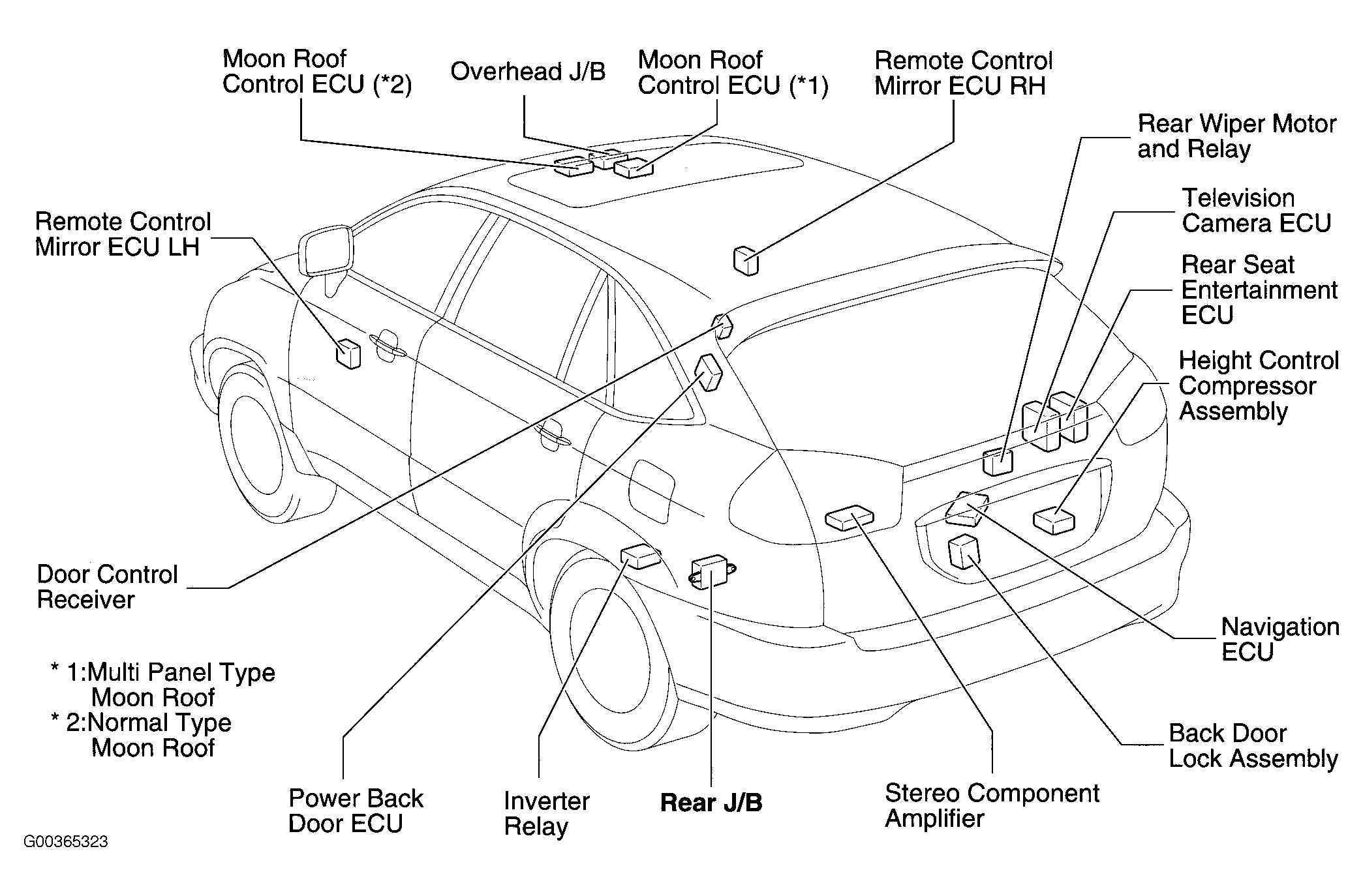 | Moon Roof Control ECU (Normal Type Moon Roof) | On front center of moon roof. See Figure. |
