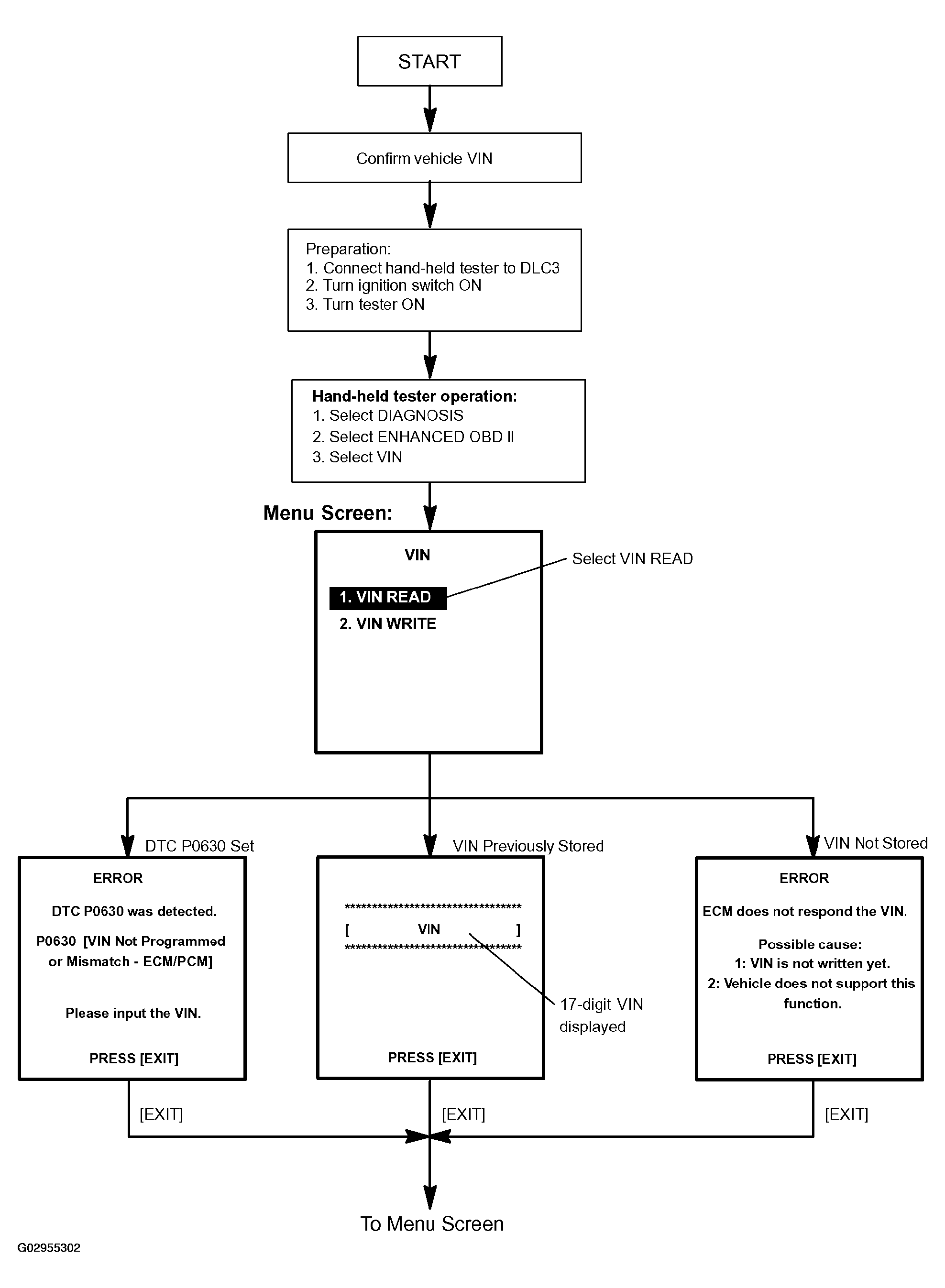 - Read VIN: Explains the VIN reading process in Fig 1. This process allows the VIN stored in the ECM to be read, in order to confirm that the two VINs, provided with the vehicle and stored in the vehicle's ECM, are the same.