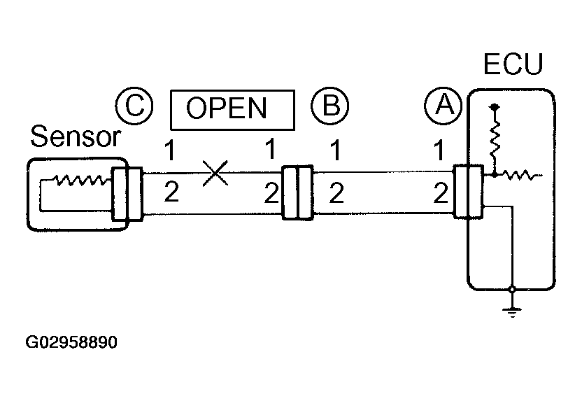 If your results match the examples above, an open circuit exists between terminal 1 of connector A and terminal 1 of connector C.