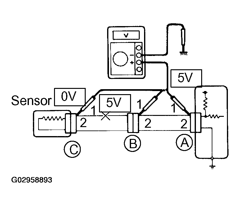 VOLTAGE SPECIFICATIONSTester Connection Specified Condition Connector A terminal 1 - Body ground 5 V Connector B terminal 1 - Body ground 5 V Connector C terminal 1 - Body ground 0 V If your results match the examples above, an open circuit exists in the wire harness between terminal 1 of connector B and terminal 1 of connector C.