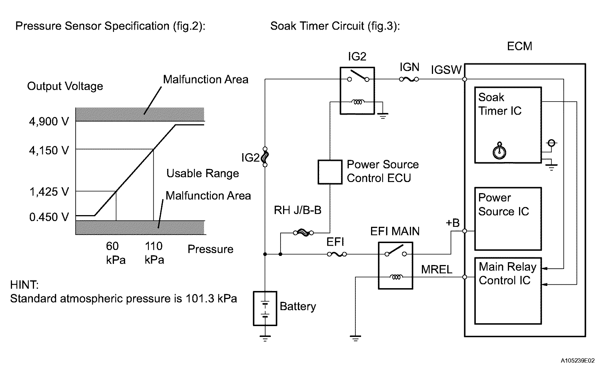 | (b) Pressure sensor | Indicates pressure as voltage. ECM supplies regulated 5 V to pressure sensor, and uses feedback from sensor to monitor EVAP system pressure (refer to Fig 5). |