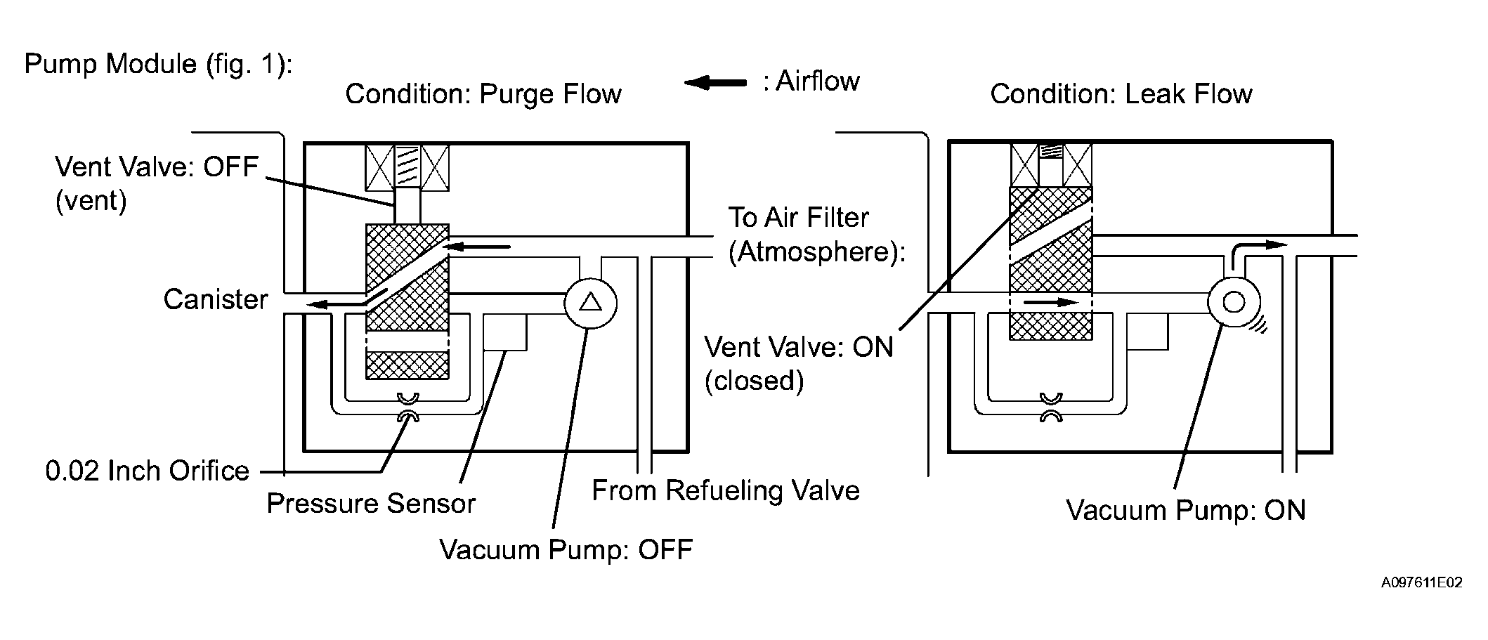 (a) Vent valve Vents and closes EVAP system. When ECM turns valve ON, EVAP system closed. When, ECM turns valve OFF, EVAP system vented. Negative pressure (vacuum) created in EVAP system to check for EVAP leaks by closing EVAP VSV, turning vent valve ON (closed) and operating vacuum pump (refer to Fig 4).