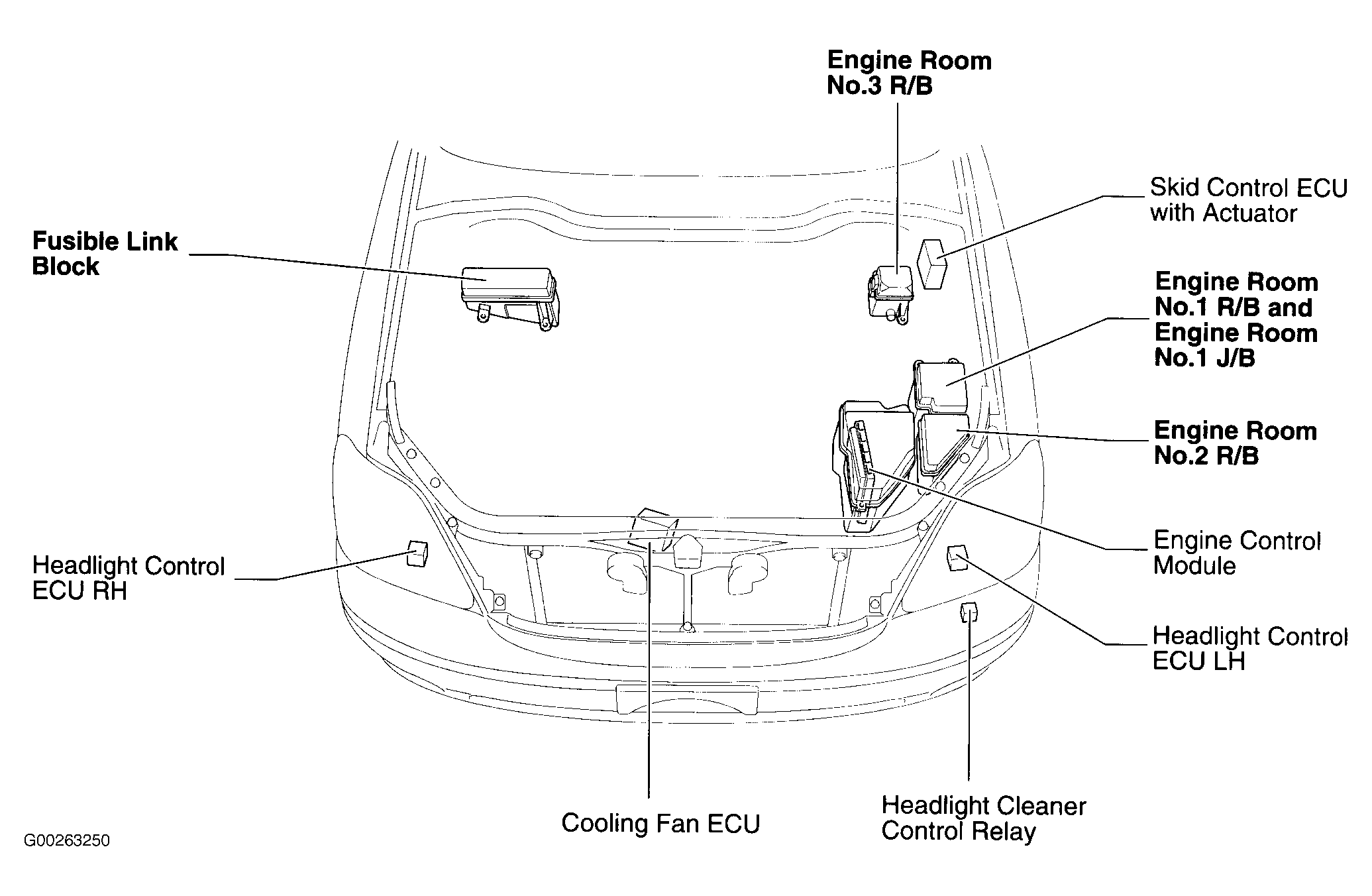 | Cooling Fan ECU | On front center of engine compartment, on radiator support. See Figure. |