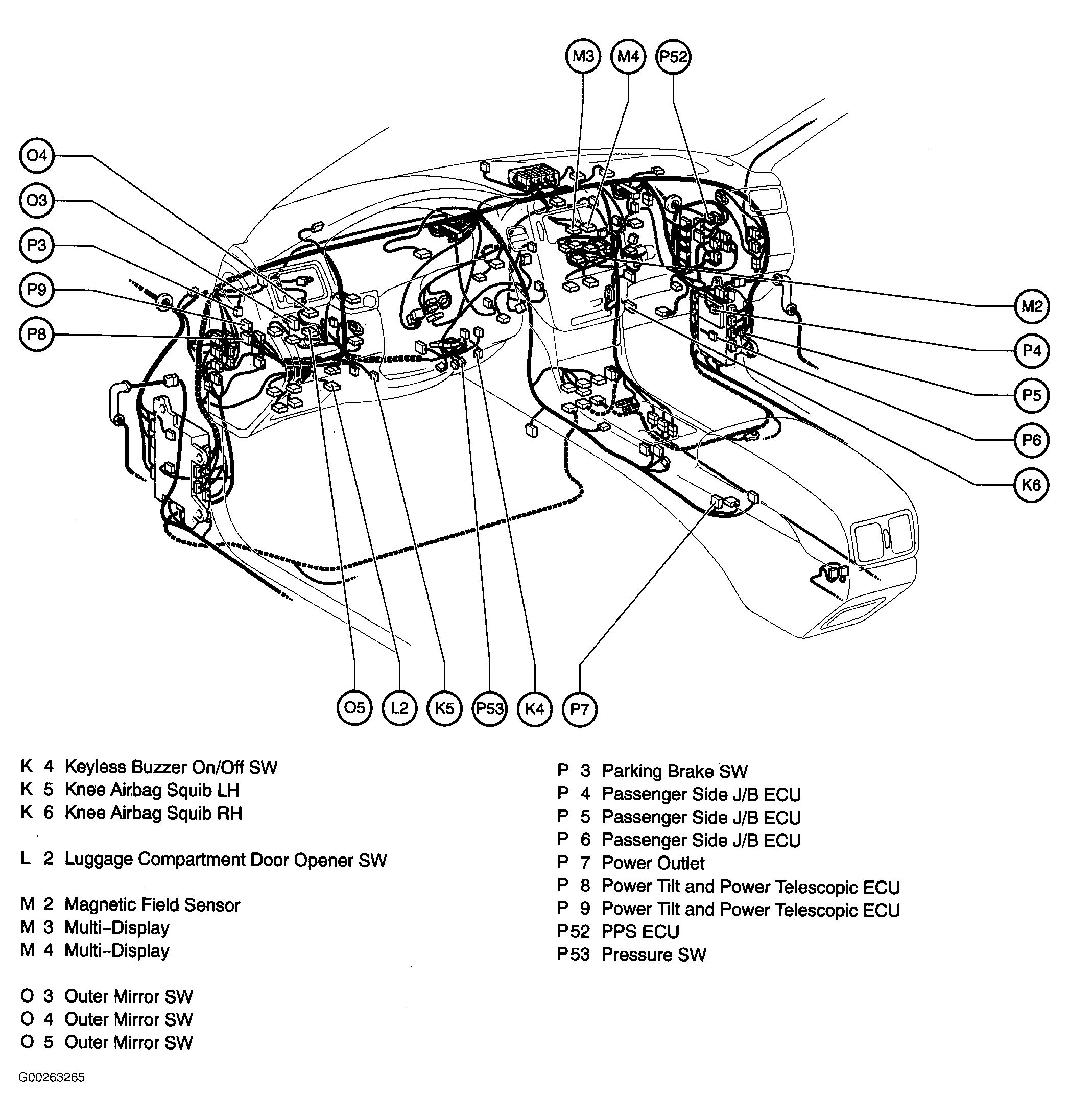 | Steering Lock ECU | Left side of dash. See Figure. |