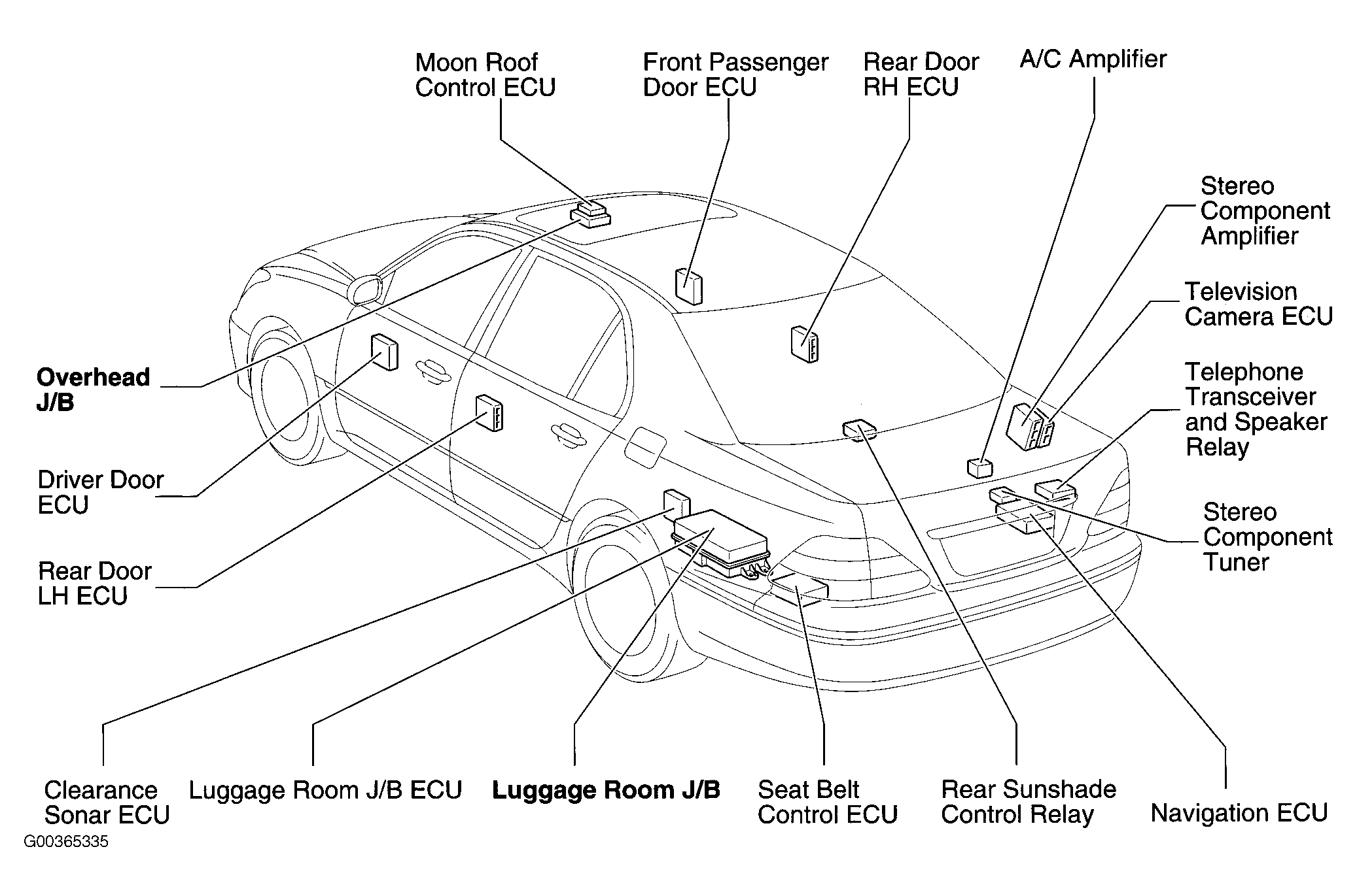| Luggage Room J/B ECU | On left side of luggage compartment. See Figure. |