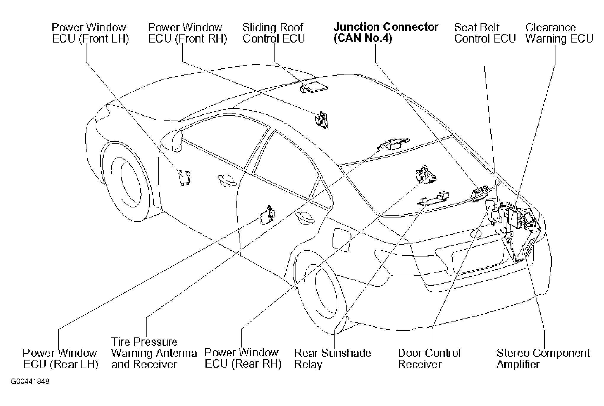 | Power Window ECU (Rear RH) | In right rear door. See Figure. |