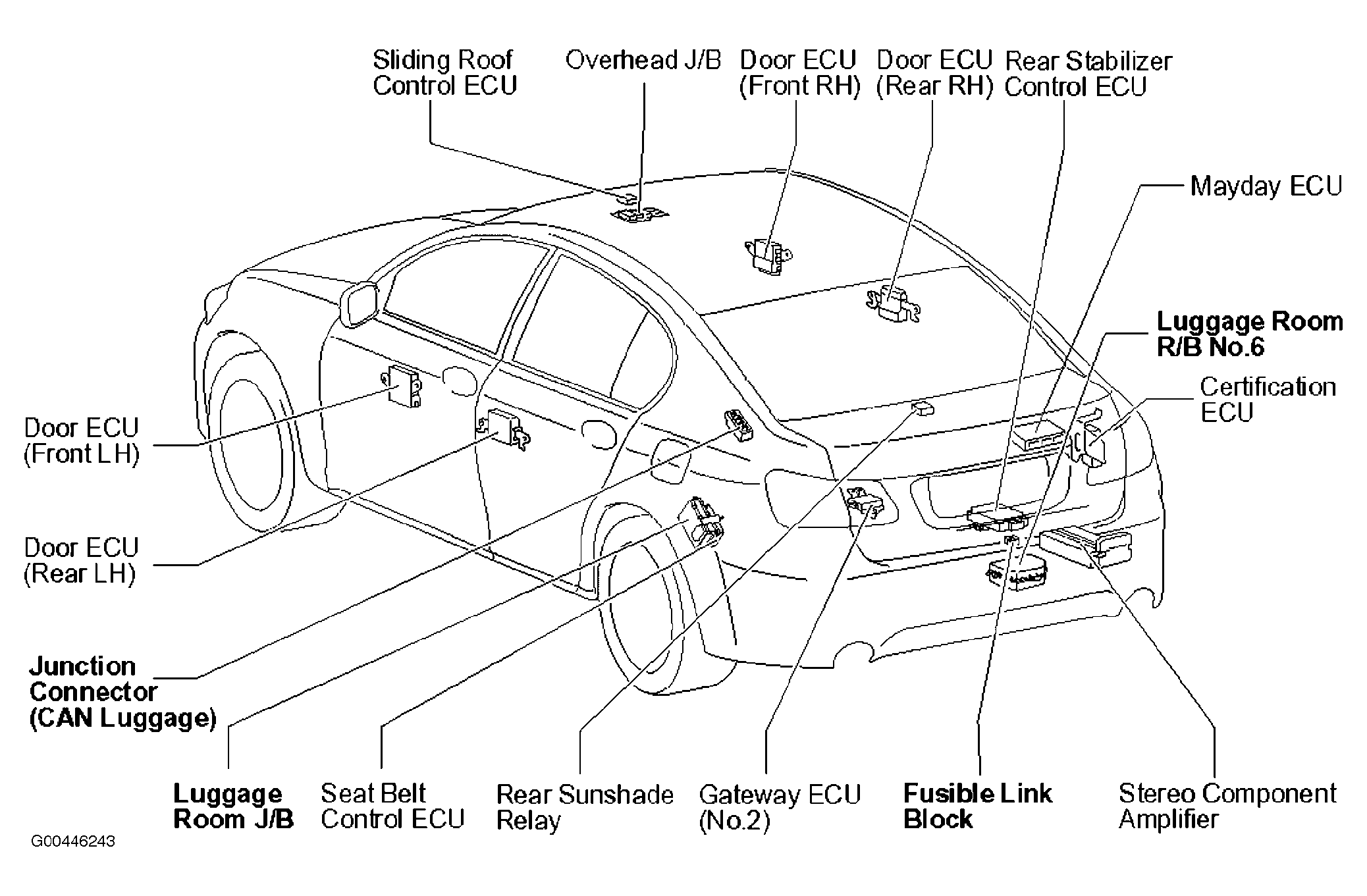 | Luggage Room R/B No. 6 | Right rear corner of luggage compartment. See Figure. |