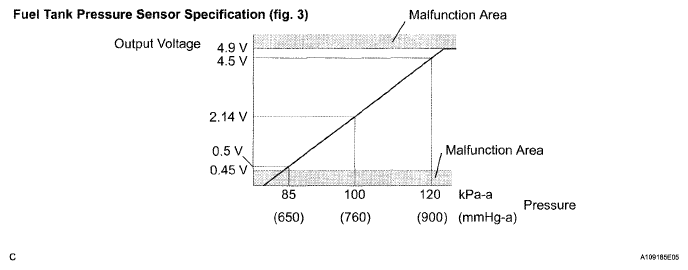 | Fuel tank pressure sensor | Converts fuel tank pressure into voltage and outputs that voltage. ECM supplies a constant voltage of 5 V to pressure sensor and uses feedback from sensor to monitor fuel tank pressure, (Fig 5) |