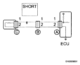 If the results match the examples above, a short circuit exists between terminal 1 of connector B2 and terminal 1 of connector C.