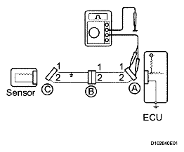 If the results match the examples above, an open circuit exists in the wire harness between terminal 1 of connector B and terminal 1 of connector C.