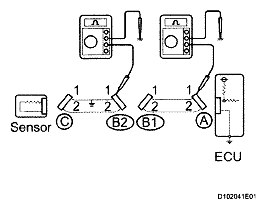 If the results match the examples above, an open circuit exists between terminal 1 of connector B2 and terminal 1 of connector C.