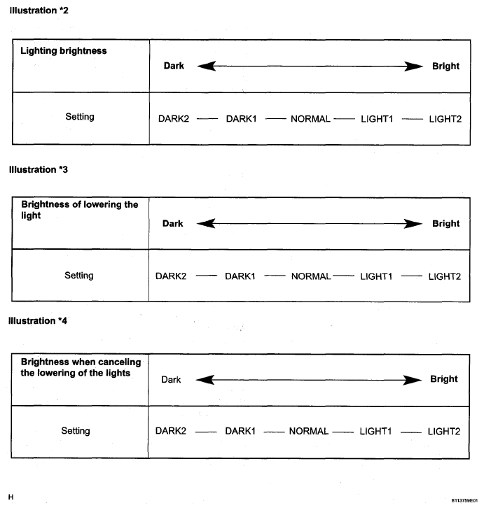 DISP EX OFF SEN (Display Extinction Release Luminous Intensity) NORMAL To change the brightness of canceling the lowering the lights such as the indicator light of the combination meter, A/C indicator light, clock. Refer to *4 illustration in Fig 1 . DARK2 / DARK1 / NORMAL / LIGHT1 / LIGHT2