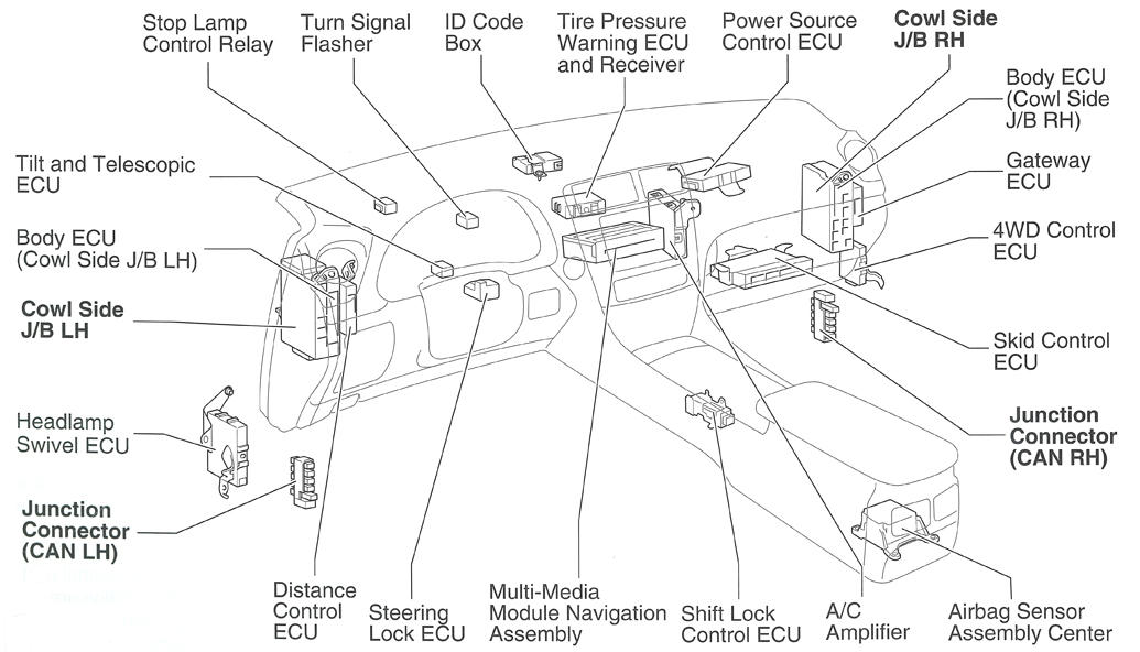 | Cowl Side J/B (LH) | At left end of dash. See Figure. |