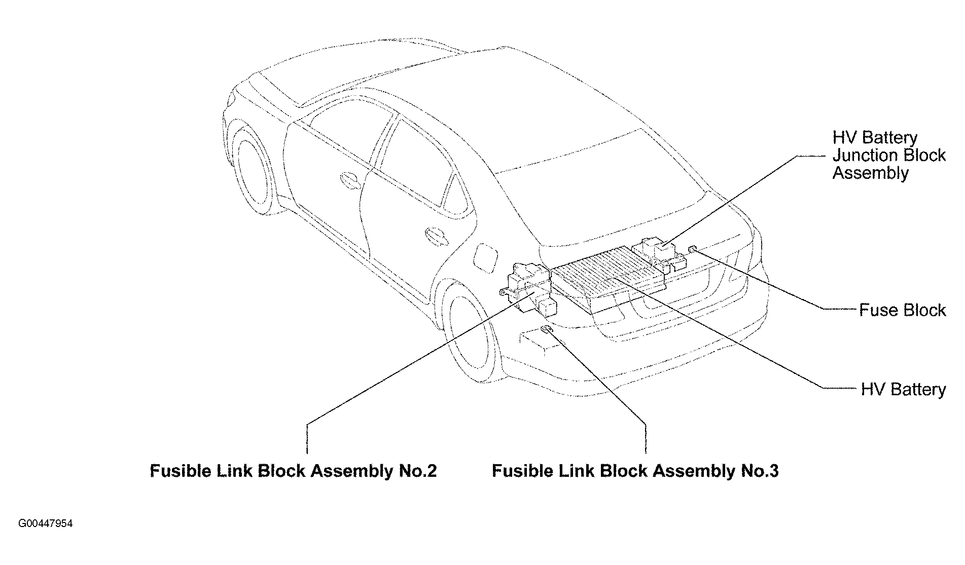| HV Battery Junction Block Assembly | Right rear of vehicle chassis. See Figure. |