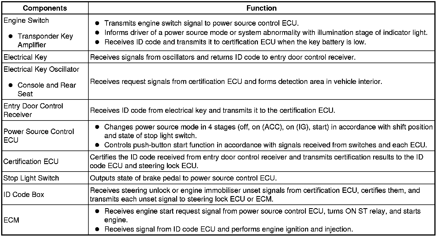 (a) The push-button start uses a push-type engine switch, which the driver can operate by merely carrying the electrical key. This system consists primarily of the power source control ECU, engine switch, ID code box, steering lock ECU, electrical key, ACC relay, IG1 relay, IG2 relay and certification ECU. The power source control ECU controls the system. This function operates in cooperation with the smart access system with push-button start.