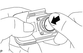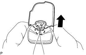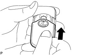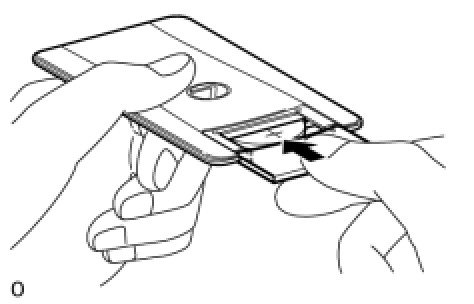(c) Push in and install the transmitter battery (lithium battery (CR2412)) while being careful of the following: 1) the orientation of the battery positive (+) and negative (-) terminals; and 2) being sure to insert the battery between the 2 terminals and deep into the card, in the direction indicated by the arrow in the illustration.