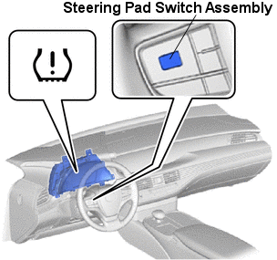 - Press and hold the tire pressure warning reset switch for 3 seconds or more until the tire pressure warning light blinks 3 times. See Fig 2.NOTE: For LS500: Use the steering pad switch assembly (Fig 3) select "Change tire pressure" on the multi-information display and press and hold the "ENTER" switch (steering pad switch assembly) until the tire pressure warming light blinks 3 times
