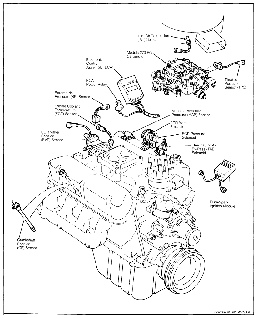 This sensor monitors all changes in manifold pressure resulting from engine load, speed, and atmospheric pressure variations. The ECA applies a 9-volt reference voltage to sensor and monitors resultant output voltage to determine part throttle spark advance and EGR flow rate. The MAP sensor is mounted on the left rocker arm cover. See Figure.