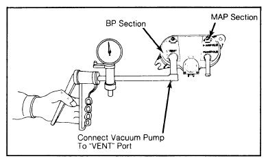 - Connect analog voltmeter positive lead to Lt. Green/Black wire (circuit No. 99) at thermactor air diverter solenoid. Connect voltmeter negative lead to ground. Apply 20" Hg of vacuum to BP/MAP sensor "VENT" port for at least 30 seconds. See Fig 1.
