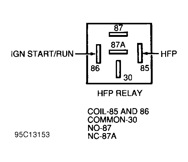 Turn ignition off. Disconnect HFP relay. Relay is located in engine compartment fuse block. Measure voltage between negative battery terminal and B(+) terminal at HFP relay vehicle wiring harness connector. See Fig 4 . Turn ignition on. Measure voltage between IGN START/RUN terminal at HFP relay connector and negative battery terminal. If both voltage readings are more than 10.5 volts, go to next step. If any reading is 10.5 volts or less, repair open in B(+) or IGN START/RUN circuit. Also, ensure all related fuses are good. After repair has been completed, reconnect all components. Recheck system operation. - 161) Check Power-To-Fuel Pump Circuit Continuity