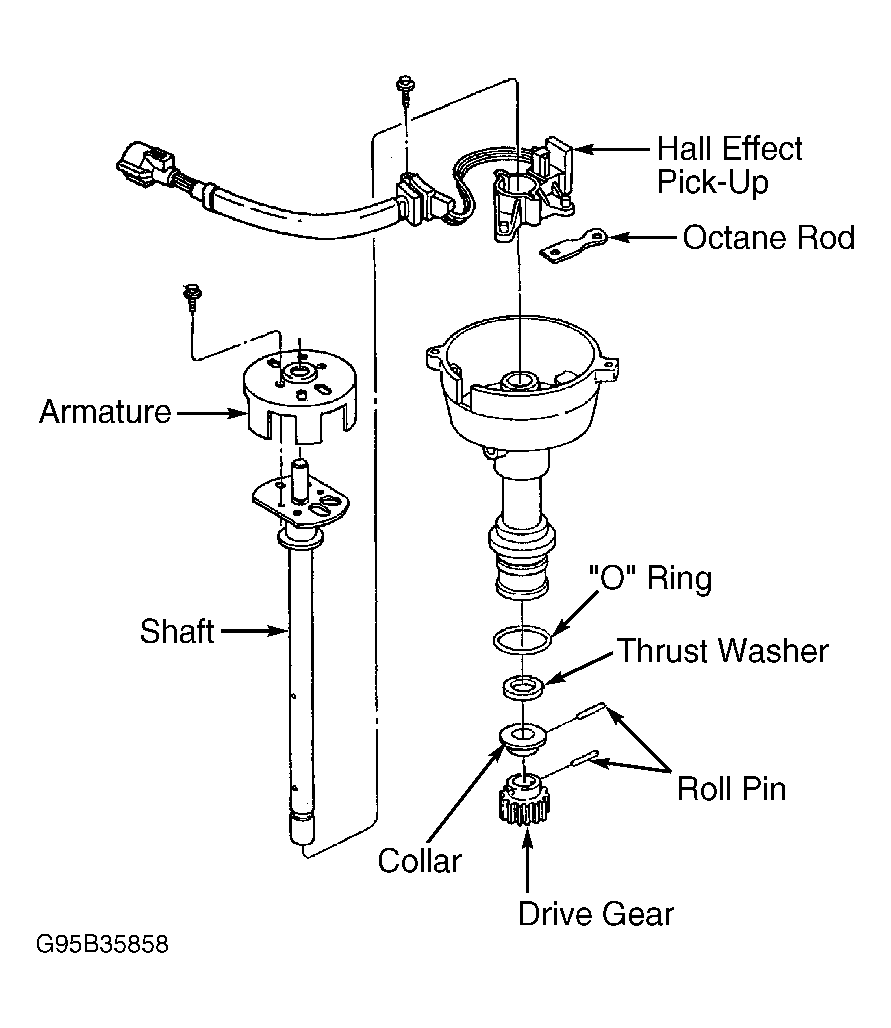 - Using an Allen wrench, hold distributor shaft from turning while removing armature bolts. DO NOT clamp shaft. Remove screws and armature. Place reference marks on drive gear, thrust collar and shaft. Using a felt-tip pen, mark shaft and gear for installation reference. Remove and discard roll pin from gear.