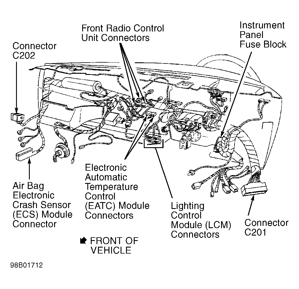 - Turn ignition off. Disconnect front radio control unit 20-pin connector C258 located behind center of instrument panel, on radio. See Figure. Turn ignition on. Perform data link diagnostic procedure. See DATA LINK DIAGNOSTIC TEST under COMMUNICATION NETWORK DIAGNOSTICS. If all modules equipped on vehicle except LCM and front radio control unit passed data link diagnostic test, replace front radio control unit and retest system for normal operation. If any module other than LCM and front radio control unit did not pass data link diagnostic test, go to next step.