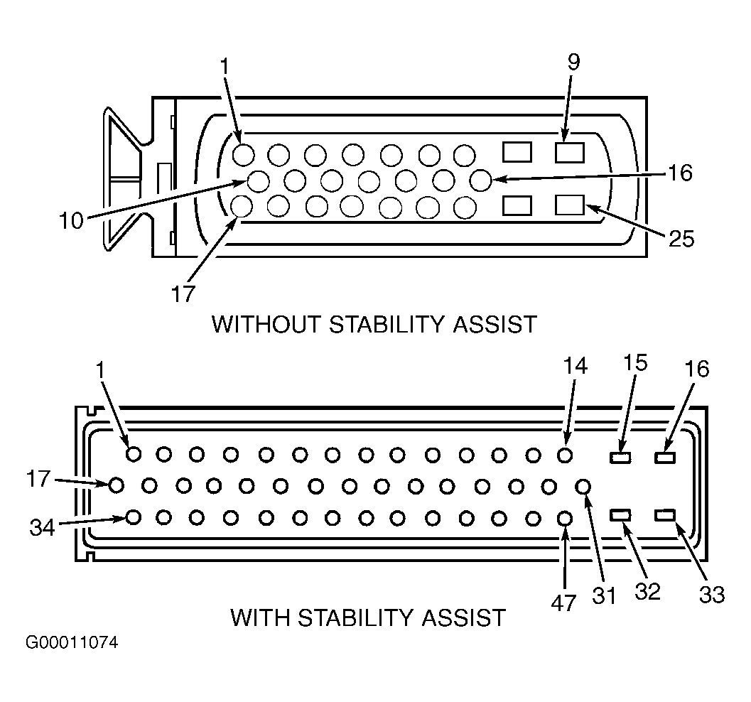 - On vehicle without stability assist, measure resistance in Gray wire between terminal No. 5 at AJB harness connector C283c and terminal No. 11 at ABS module harness connector. See Fig 1 and Fig 2 . On vehicle with stability assist, measure resistance in Gray wire between terminal No. 5 at AJB harness connector C283c and terminal No. 17 at ABS module harness connector. On all vehicles, resistance should be 5 ohms or less. If resistance is as specified, go to next step. If resistance is not as specified, repair open in Gray wire between AJB and ABS module. Retest system for normal operation.