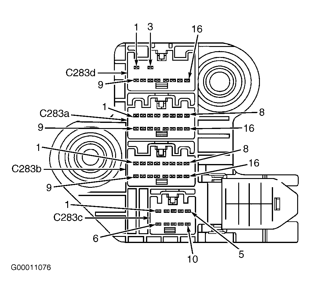 - Disconnect AJB harness connector C283d, located behind left side of instrument panel. See Figure . Measure resistance between terminal No. 8 at AJB connector C283b and terminal No. 16 at AJB connector C283d (component side). See Figure . If resistance is 5 ohms or less, go to next step. If resistance is greater than 5 ohms, replace AJB and retest system for normal operation.