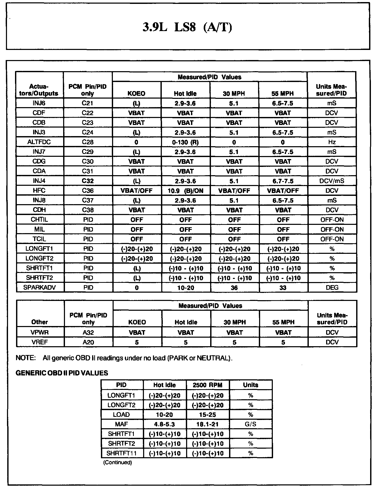Normal Scan Data Values - Includes PIDs