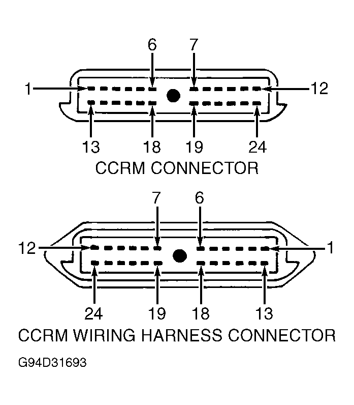 Turn ignition switch to OFF position. Disconnect CCRM connector. See CCRM LOCATIONS  table. Using a DVOM, measure HFC relay coil resistance between CCRM terminals No. 17 (HFC) and No. 24 (VPWR). See Figure. Resistance should be 65-110 ohms. Also, measure CCRM internal resistance between terminal No. 17 and terminals No. 1-11, 13 and 21, and CCRM case. Measure resistance of CCRM between terminals No. 15 and 17 (it may be necessary to switch the Red and Black DVOM probes to get resistance reading greater than 1000 ohms). Each resistance should be more than 1000 ohms. If all resistances are as specified, leave CCRM disconnected and go to next step. If any resistance is not as specified, replace CCRM.