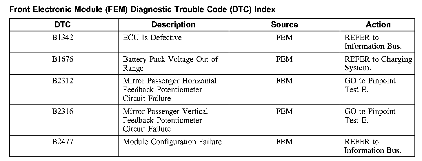 Front Electronic Module (FEM) Diagnostic Trouble Code (DTC) Index