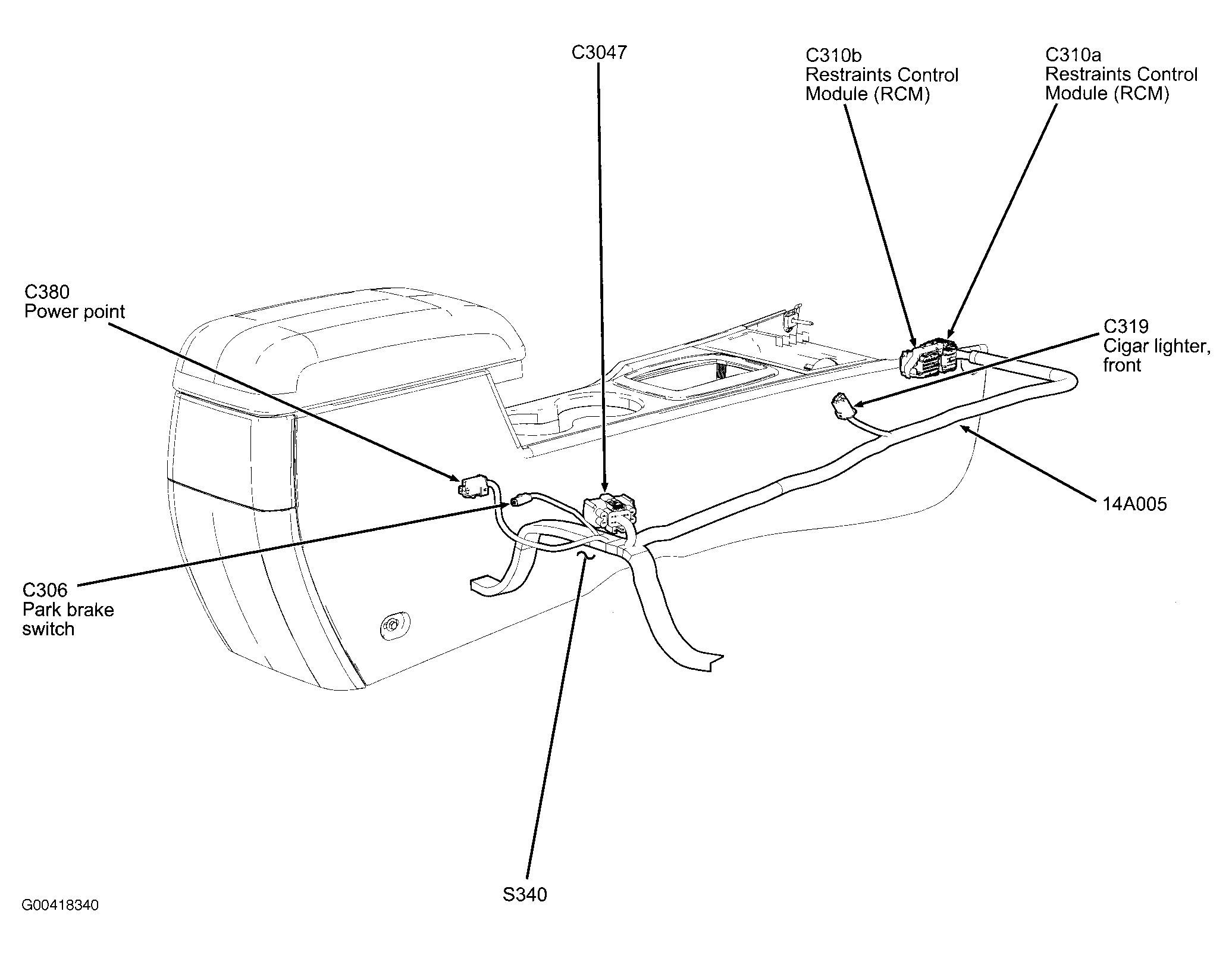| Restraints Control Module (RCM) | Under center console. See Figure. |
