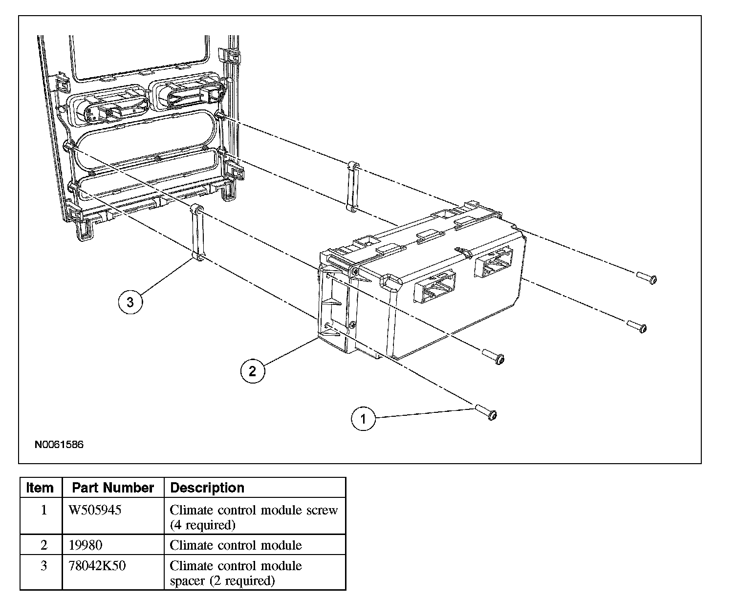 4. NOTE: Be sure the climate control module spacers are correctly positioned before installing the climate control module.