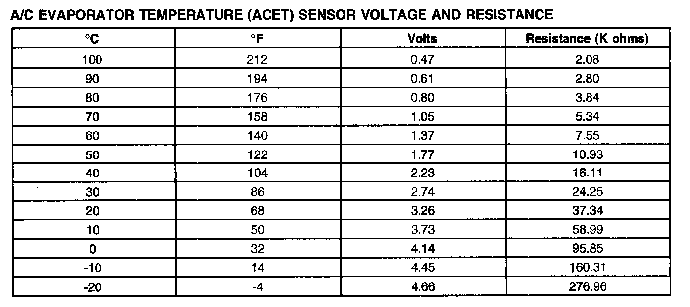 A/C Evaporator Temperature (ACET) Sensor Voltage And Resistance: