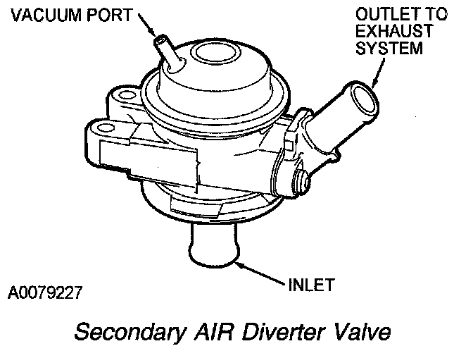 The secondary AIR diverter valve is used with the secondary AIR pump to provide on/off control of air to the exhaust manifold and catalytic converter. When the secondary AIR pump is on and vacuum is supplied to the AIR diverter valve, air passes the integral check valve disk. When the secondary AIR pump is off, and vacuum is removed from the AIR diverter valve, the integral check valve disk is held on the seat and stops air from being drawn into the exhaust system and prevents the back flow of the exhaust into the secondary AIR system.