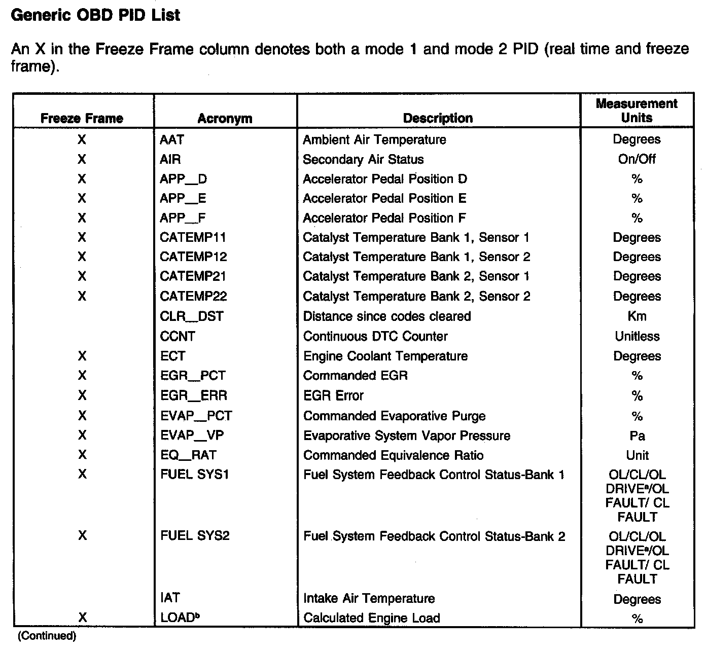 The parameter identification (PID) mode allows access to powertrain control module (PCM) information. This includes analog and digital signal inputs and outputs along with calculated values and the system status. There are 2 types of PID lists available and both are used. The first is the generic (J1979) OBD PID list. This is a standard set of PIDs that all scan tools must be able to access. The second is a Ford-specific (J2190) list which can be accessed by an appropriate scan tool. When accessing any of these PIDs, the values are continuously updated. The generic or Ford PID list provides definitions and values in appropriate units. For more information, refer to the Society of Automotive Engineers (SAE) document J2205.