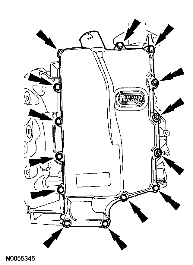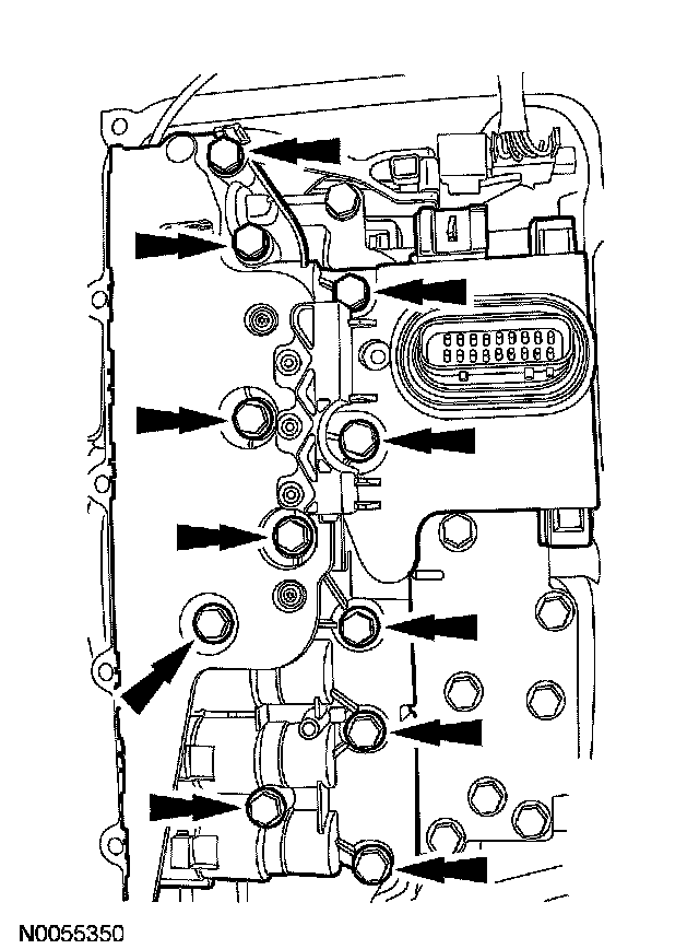 11. CAUTION: Inspect the 20 pin solenoid body connector seal to make sure that the seals is on the inside of the main control cover. Transmission fluid leak will occur.