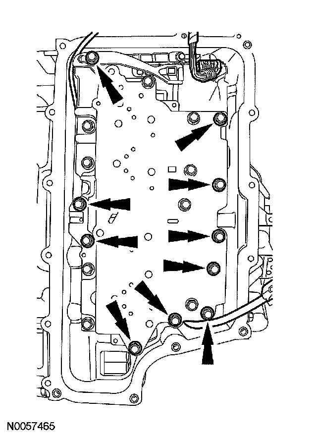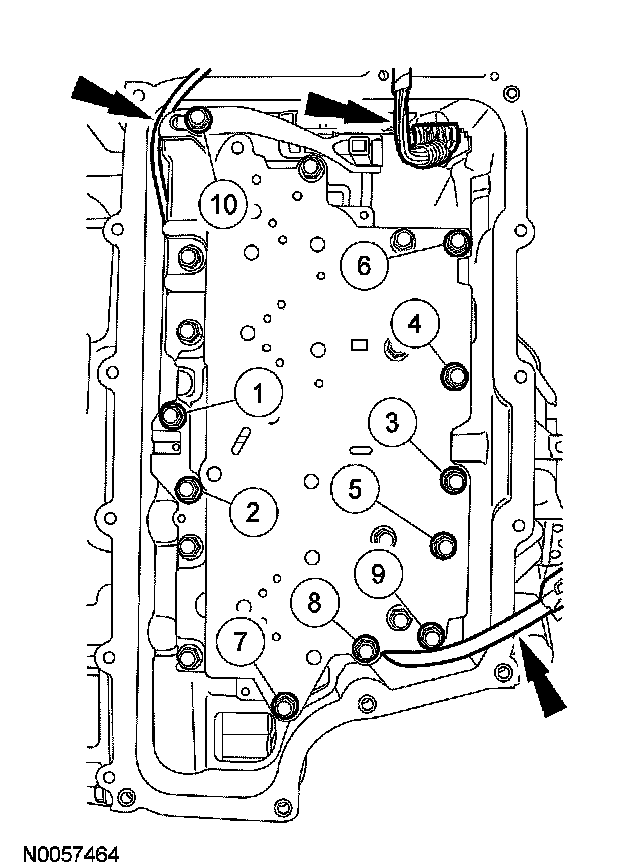Position the TSS, OSS and TR sensor wiring harnesses aside and install the main control valve body, the TR sensor detent spring and the 10 bolts. Tighten the bolts in the sequence shown.